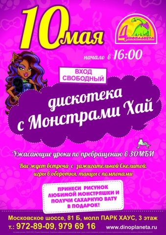 Мероприятие состоялось Дискотека с Монстрами Хай в Динопланете, Самара 1033 0СамараСамарская областьДетские праздники Место: Клуб «Планета Боулинг», Самара, г. Самара, Московское шоссе, 81 Б, молл «ПАРК ХАУС», 3 этажТелефон: 972-89-09, 979-69-16Возрастная группа: 0+ Стоимость: 0 руб.Детский развлекательный комплекс «Динопланета» приглашает на дискотеку с Монстрами Хай детей всех возрастов.